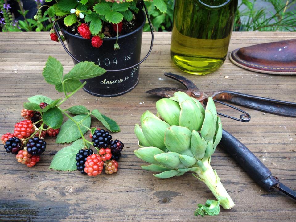 花壇をのみこんだ木苺をかきわけたら、その茂みの中でひっそり実をつけていてくれたアーティチョーク。ひょっとして私に見つかったら食べられるのを感づいていたのかな。